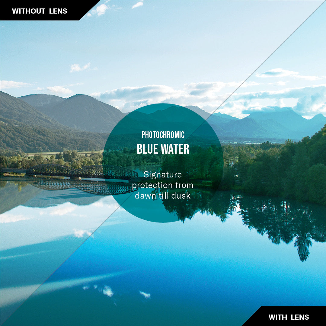 Lentes fotocromáticas Blue Water bloquean del 74% al 91% de la luz visible (Transmisión de Luz Visible del 26% al 9%)