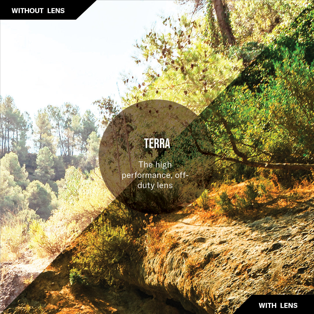 Terra es la lente para caminos menos transitados y vistas que valen el viaje. Con una base marrón y un espejo sutil, esta lente polarizada resalta los tonos terrosos, protege contra los rayos UV y mejora la claridad, desde verdes bañados por el sol hasta senderos cubiertos por el dosel.